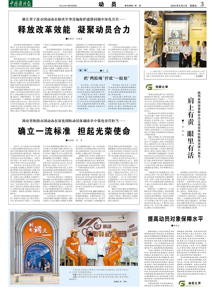 我们的国防是全民国防,未来战争中将有一大批人员担负国防勤务,与民兵队伍一同上阵、共同完成任务。宜未雨绸缪,勿临渴掘井。各地应以使命任务为牵引,打牢国防动员专业保障队伍建设基础,包括参照保障民兵的做法,筹划部署专业保障队伍自身保障工作,为他们未来遂行任务做好充足准备、当好坚强后盾。