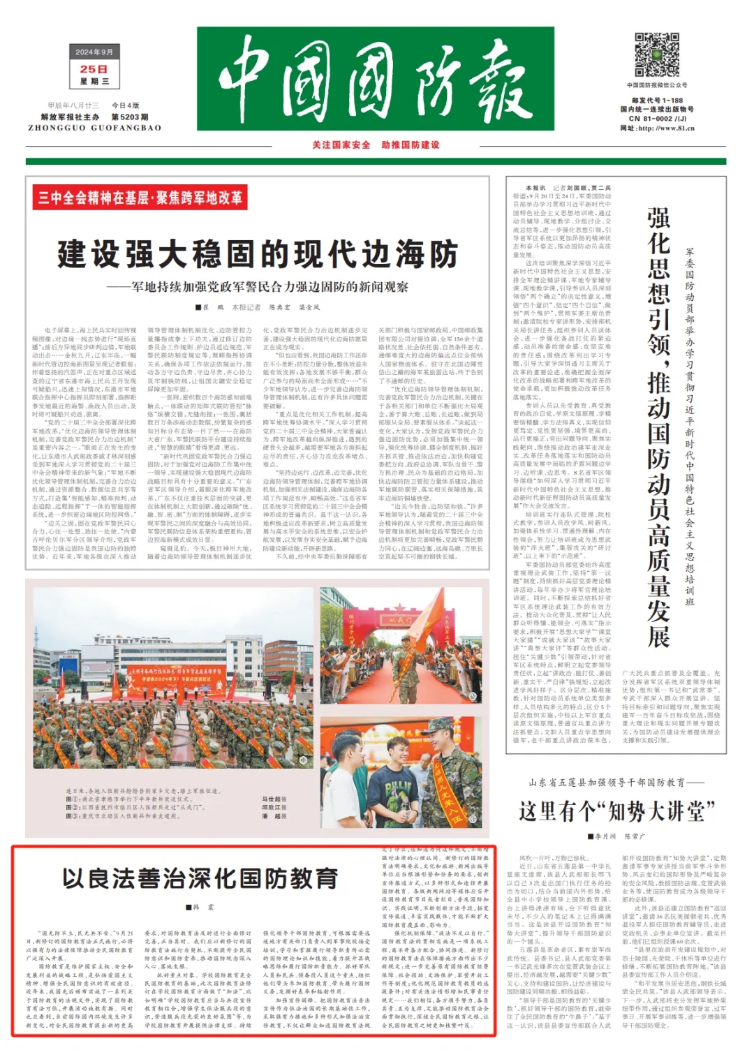 国防教育是维护国家主权、安全和发展利益的战略工程,是弘扬爱国主义精神、增强全民国防意识的有效途径。近年来,我国先后颁布实施了一系列关于国防教育的法规文件,实现了国防教育有法可依,开展活动施教有据。同时也应看到,当前国际国内环境发生许多新变化,对全民国防教育提出新的更高要求,对国防教育法及时进行全面修订完善,正当其时。我们应以新修订的国防教育法施行为契机,不断提升全民国防意识和国防素养,推动国防观念深入人心、落地生根。