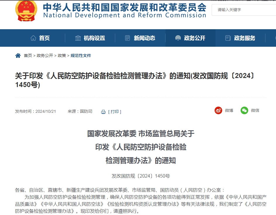 近日,为加强人民防空防护设备检验检测管理,确保人民防空防护设备的各项功能得到正常发挥,依据《中华人民共和国产品质量法》《中华人民共和国人民防空法》《检验检测机构资质认定管理办法》等有关法律法规,国家发展和改革委员会、国家市场监督管理总局正式印发《人民防空防护设备检验检测管理办法》,该办法将于2025年1月1日施行。